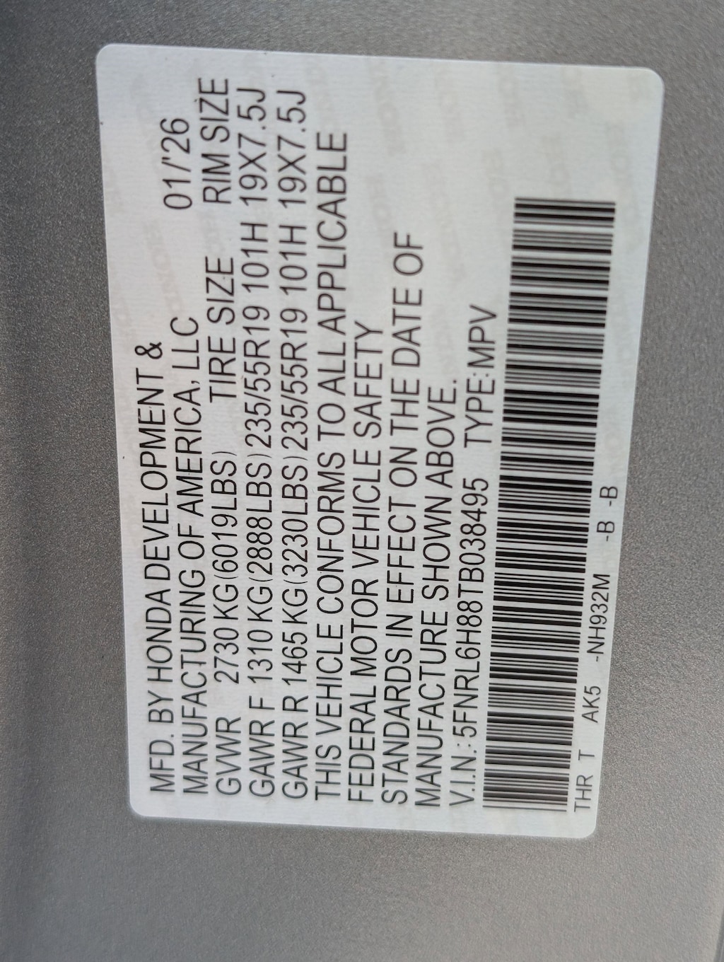 Tires: 235/55R19 101H All-Season, Tire Specific Low Tire Pressure Warning, Tailgate/Rear Door Lock Included w/Power Door Locks, Strut Front Suspension w/Coil Springs, Steel Spare Wheel, Smart Device Remote Engine Start, Smart Device Integration, Single Stainless Steel Exhaust, Side Impact Beams, Seats w/Leatherette Back Material, Removable 40-20-40 Folding Split-Bench Front Facing Manual Reclining Fold Forward Seatback Rear Seat w/Manual Fore/Aft and Magic Slide 2nd-Row Seats Side-To-Side Sliding, Remote Releases -Inc: Power Cargo Access, Remote Keyless Entry w/Integrated Key Transmitter, 2 Door Curb/Courtesy, Illuminated Entry, Illuminated Ignition Switch and Panic Button, Rear HVAC w/Separate Controls, Rear Entertainment System w/Digital Media, Rear Cupholder, Rear Child Safety Locks, Real-Time Traffic Display, Radio w/Seek-Scan, Clock, Voice Activation and My Honda Music Internal Memory, Proximity Key For Doors And Push Button Start.