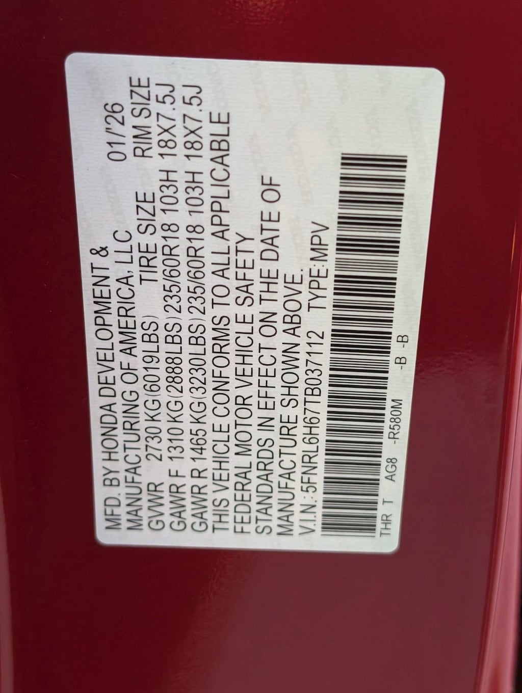 Vin: 5FNRL6H67TB037112