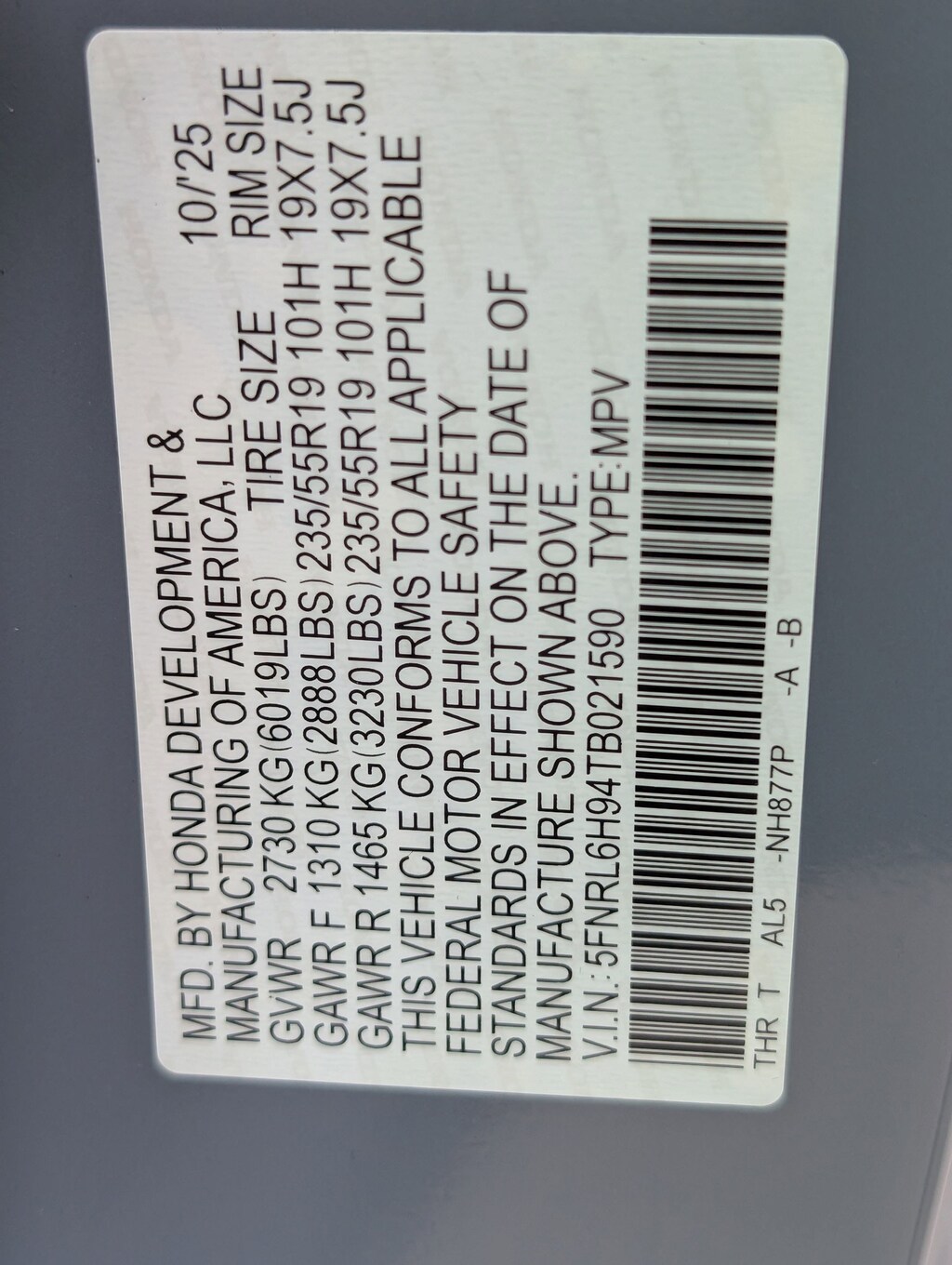 Tires: 235/55R19 101H All-Season, Tire Specific Low Tire Pressure Warning, Tailgate/Rear Door Lock Included w/Power Door Locks, Strut Front Suspension w/Coil Springs, Steel Spare Wheel, Smart Device Remote Engine Start, Smart Device Integration, Single Stainless Steel Exhaust, Side Impact Beams, Seats w/Leatherette Back Material, Removable 40-20-40 Folding Split-Bench Front Facing Manual Reclining Fold Forward Seatback Rear Seat w/Manual Fore/Aft and Magic Slide 2nd-Row Seats Side-To-Side Sliding, Remote Releases -Inc: Proximity Cargo Access, Remote Keyless Entry w/Integrated Key Transmitter, 2 Door Curb/Courtesy, Illuminated Entry, Illuminated Ignition Switch and Panic Button, Rear HVAC w/Separate Controls, Rear Entertainment System w/Digital Media, Rear Cupholder, Rear Child Safety Locks, Real-Time Traffic Display, Radio w/Seek-Scan, Clock, Voice Activation and My Honda Music Internal Memory, Proximity Key For Doors And Push Button Start.