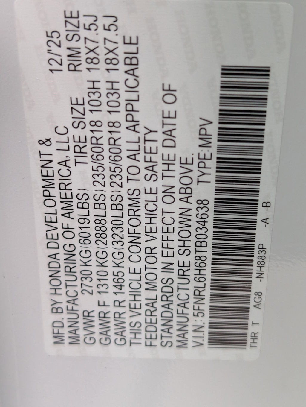Vin: 5FNRL6H68TB034638