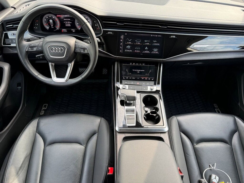 Inside, the cabin showcases Audi's commitment to modern luxury and innovation. Premium materials, a clean architectural design, and a driver-focused layout create an environment that feels upscale and intuitive. Advanced digital displays, seamless infotainment, and smart connectivity features keep you informed and in control, while spacious seating and versatile cargo capacity make the Q8 as practical as it is stylish.