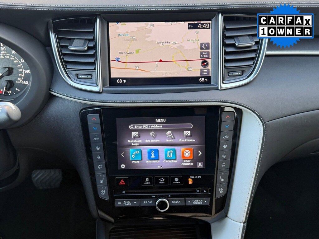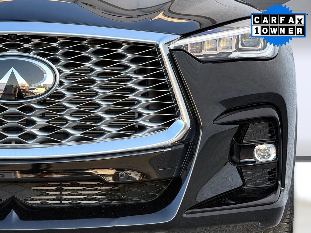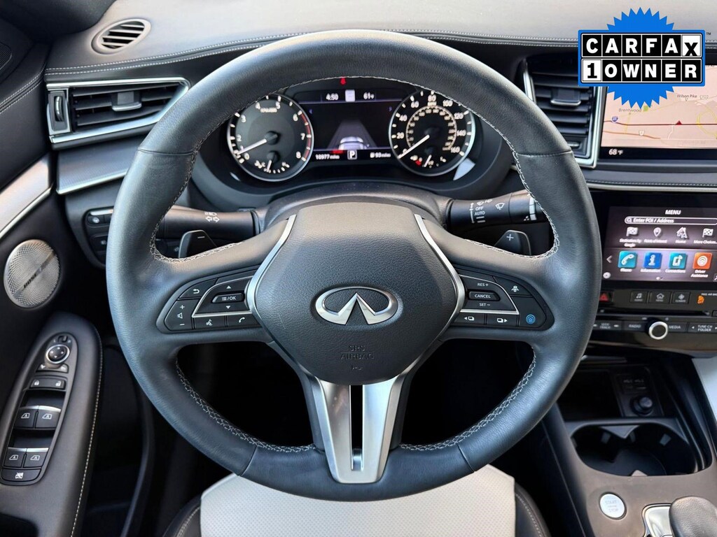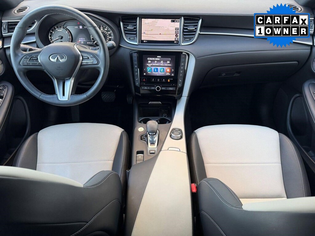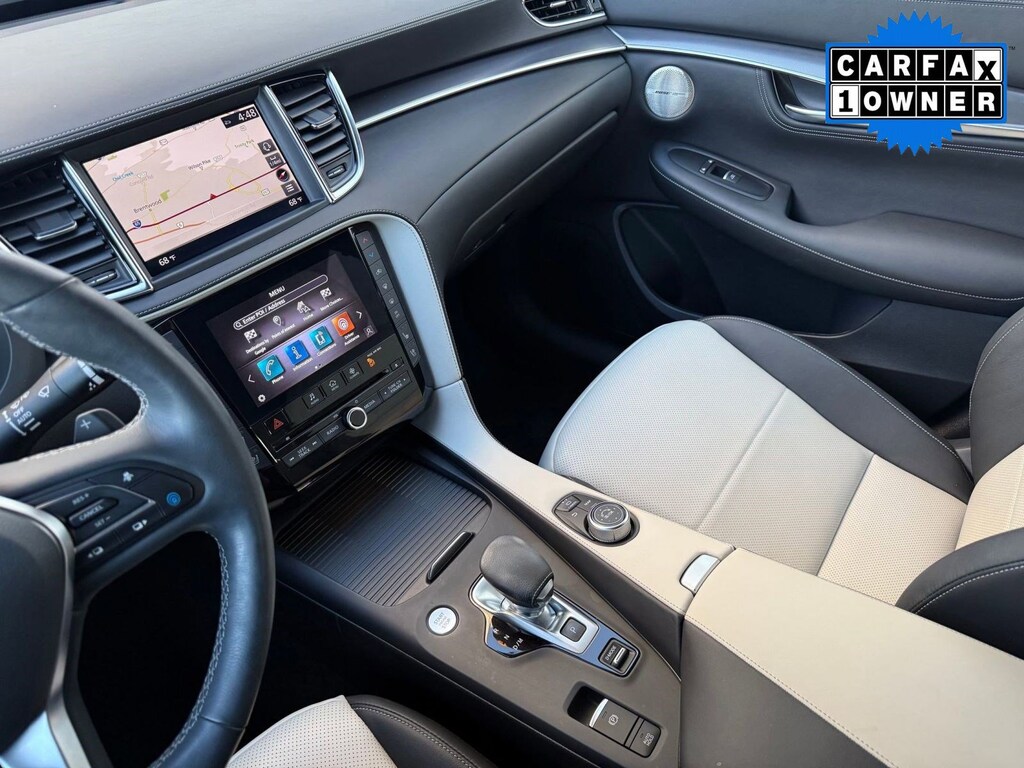 Inside, the cabin reflects INFINITI's commitment to craftsmanship and innovation. Premium materials and thoughtful detailing create a sophisticated atmosphere. The advanced infotainment system features dual touchscreen displays with navigation capability, Apple CarPlay, Android Auto, Bluetooth connectivity, and a premium audio system for an immersive driving experience. A digital driver display keeps essential information easily accessible, while dual-zone climate control and power-adjustable seating enhance comfort on every journey.